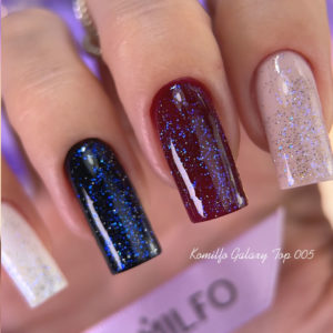 - Apply 2 coats of Komilfo color gel polish . Remember to seal every layer (including base and top). The polymerization time of the color gel polish in the LED lamp is 30 seconds. For UV and weak lamps, we recommend applying a thin layer of color gel polish, due to the high pigmentation of the gel polish. The polymerization time in a UV lamp is 2 minutes. Warning: if you want to use highly pigmented gel polishes, your UV lamp must be at least 36 W and the ice lamp must be at least 9 W, and the bulbs must be changed in a timely manner.