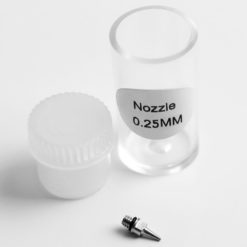 - Сопло. Насадка из металла, через которую происходит подача смешанной с воздухом краски, диаметром выхода 0,2 мм. Фиксируется на резьбу, также предусмотрена прокладка. Поставляется в герметичном тубусе, чтобы сопло не повредилось и не загрязнилось при транспортировке.